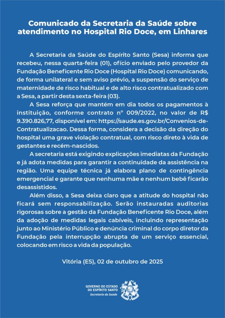 A Secretaria expressou preocupação com a decisão do Hospital Rio Doce de suspender, a partir de sexta-feira (03), os atendimentos da maternidade. A Sesa enfatizou que todos os repasses financeiros à instituição estão em dia, conforme o contrato citado. A Secretaria considera a suspensão como uma grave violação contratual e anunciou medidas para garantir a continuidade da assistência na região, incluindo a elaboração de um plano de contingência emergencial.